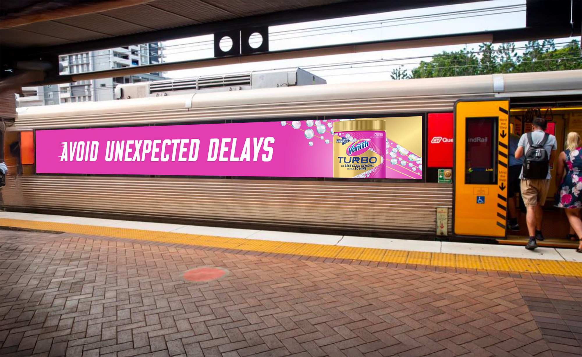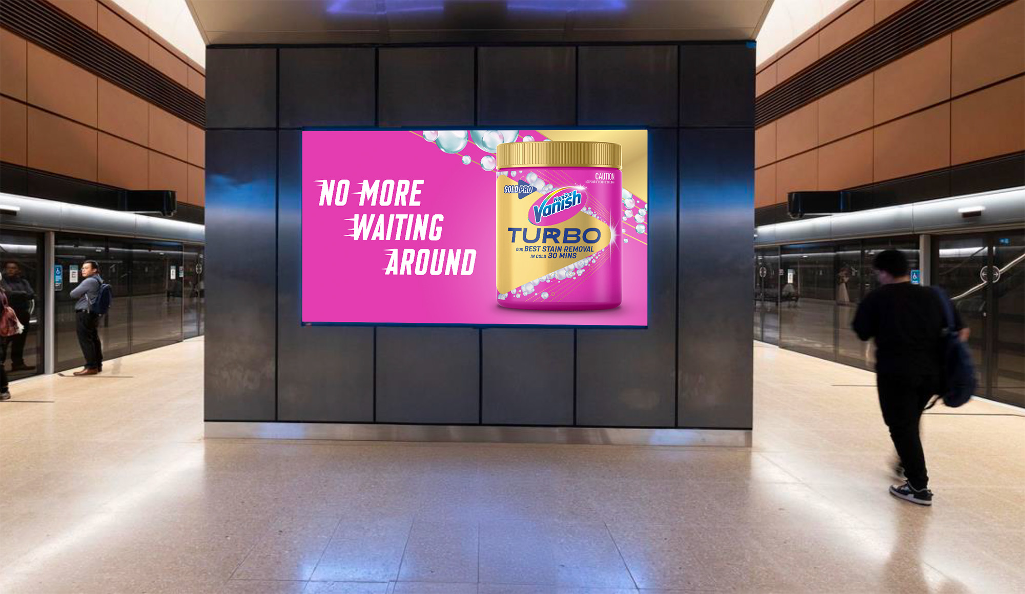 Development of time-based visual concepts that connect commuter frustration with the speed benefit of NEW Vanish Turbo in transit OOH environments.